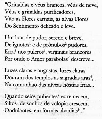 Além da sexualidade, tema presente na obra de Cruz e Souza, esse son.y: remete a algumas outras características suas, como a obsessão pela cor ca e por tudo aquilo que sugere brancura: "véus brancos", "véus de neve "alvas Flores", "luar", "virginais brancores", "luzes claras", "níveas hóstia "alvadias". Repare que a linguagem dos simbolistas, com seus apelos se:-_- soriais, seus símbolos e jogos de vogais, não se assemelha à de nenh= outra estética. A musicalidade e as frequentes aliterações são outra ma::E da poesia daquele que já foi chamado de Cisne Negro ou mesmo de Negro. Como exemplo, uma famosa estrofe do poema "Violões que chorar: